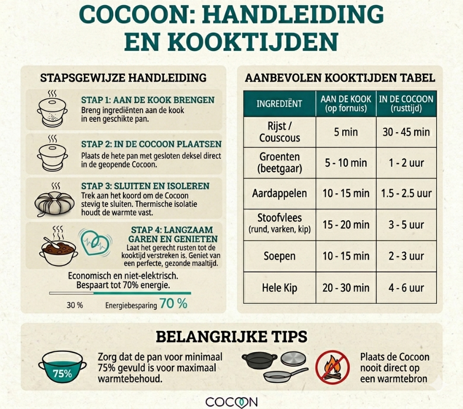 - Veiligheid: De Cocoon is niet geschikt voor gebruik in de oven of direct op een fornuis.