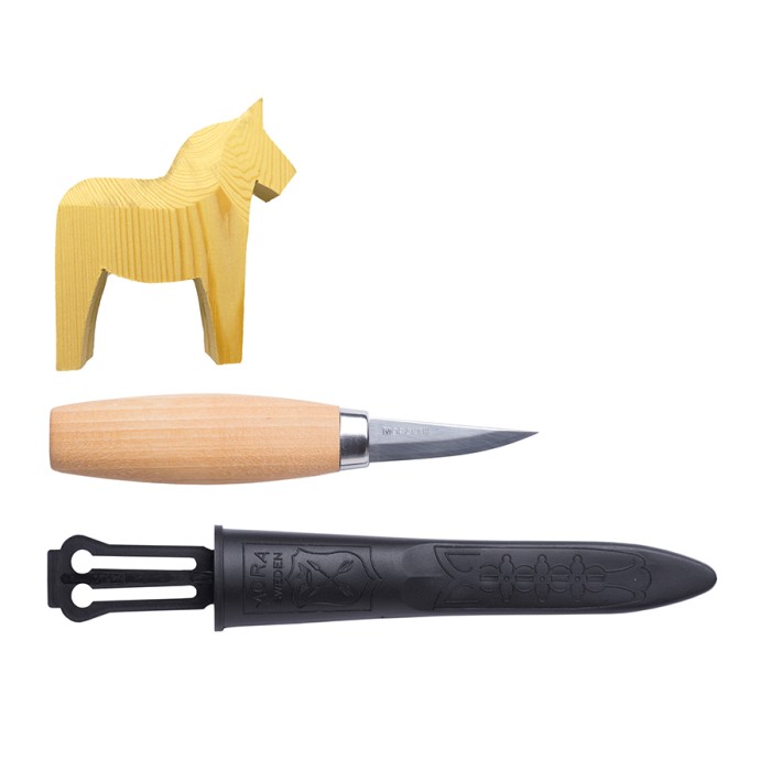 - Complete Set: Deze set bevat alles wat je nodig hebt om te beginnen met houtbewerken, inclusief het Morakniv Wood Carving 120 Carbon mes met kunststof schede en een ruw houten Dala-paardje om je creativiteit op los te laten.